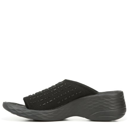 Stretch fabric upper in a casual wedge sandal style with an open toe