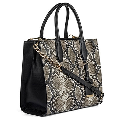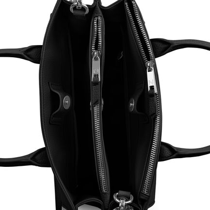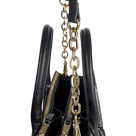 Dual magnetic snap and zip closures, Interior secure zip and slip pockets for smaller items, Detachable charm, Synthetic materials, textile lining, Adjustable, detachable chain strap, Twin handles, 5 1/2 inch drop, 12 inches long, 11 inches high, 5 1/2inches wide.