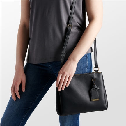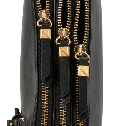 3 metal zip closure compartments, Detachable charm, Synthetic materials, textile lining, Adjustable strap for crossbody wear, 24 inch drop, 10 inches long, 8 inches high, 3 inches wide.