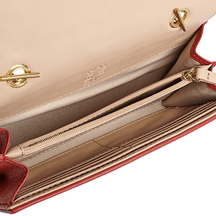 Interior coin zip pocket, sections for organization and 6 credit card slots