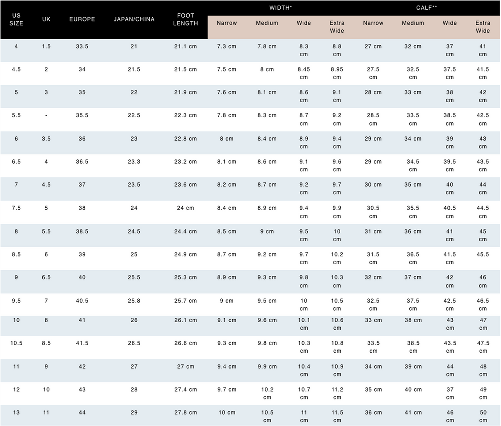 ** To find your calf circumference, measure the fullest part of your calf and use the table above to determine your best fit.